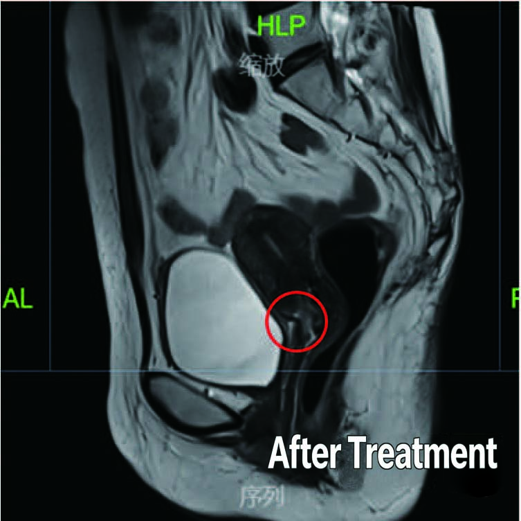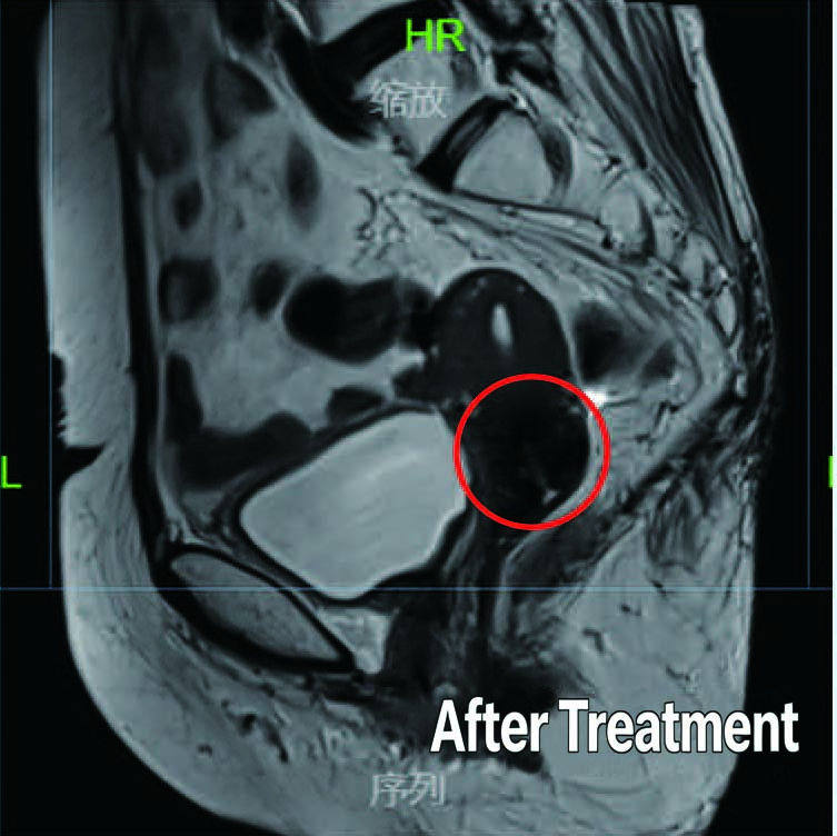 Outcome: Substantial reduction in tumor size noted post-treatment, with complete disappearance of the large tumor.