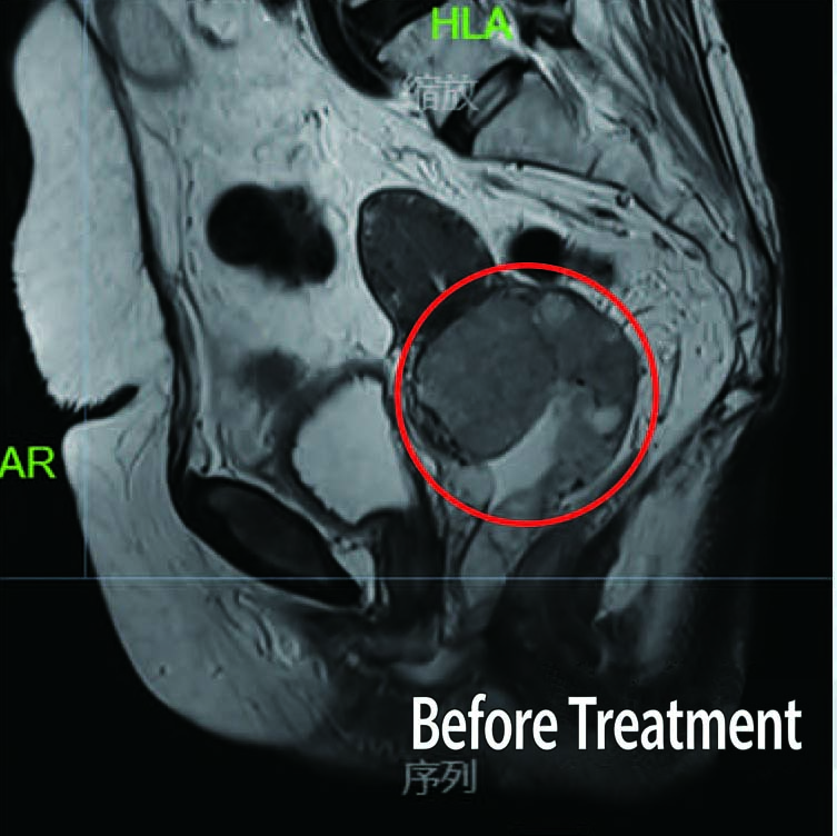 Outcome: Significant reduction in the size of the tumor observed post-treatment, with complete disappearance of the large tumor.