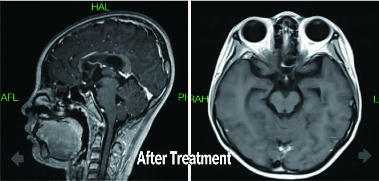 Outcome:Follow-up imaging 10 months later showed a significant reduction in tumor size in the saddle and pineal regions compared to previous scans.