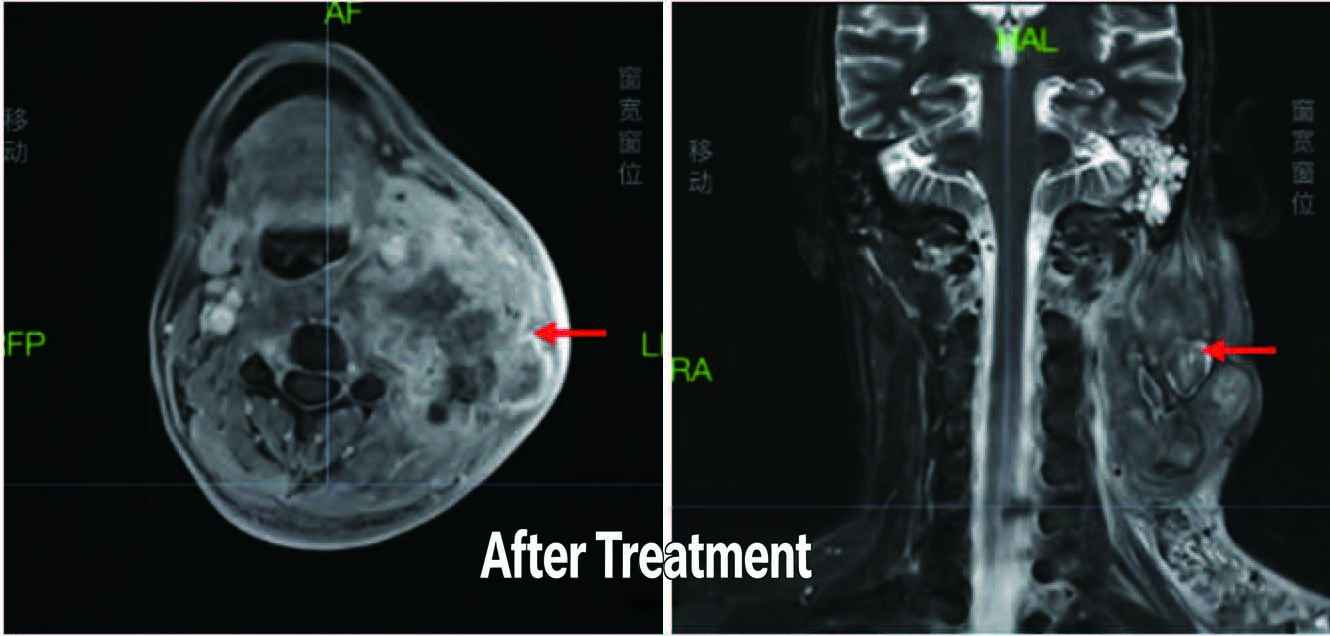 Outcome:Three months after treatment, imaging revealed a significant reduction in the size and number of metastatic lymph nodes in the neck compared to previous scans.